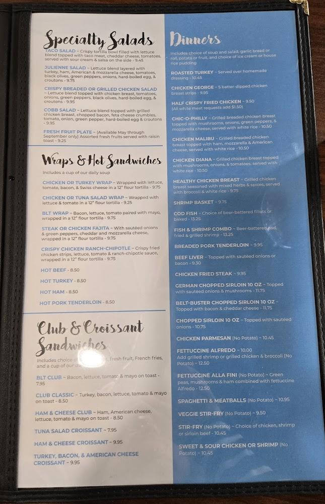 Dinner features hearty entrees, including fried chicken, roasted turkey, and fish options. Many meals come with sides like mashed potatoes and veggies, ensuring satisfaction.