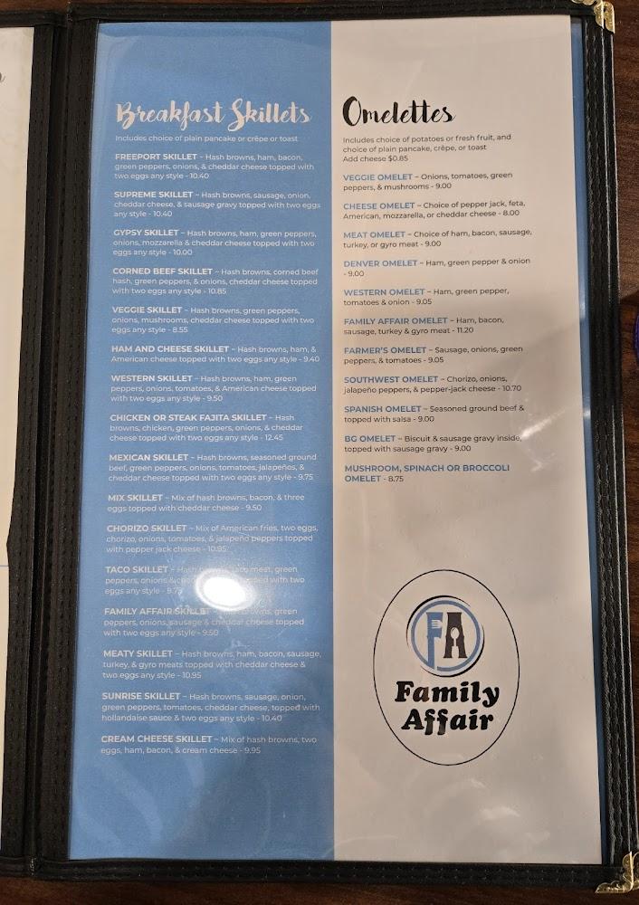 The menu at Family Affair is a delightful mix of American comfort food. Breakfast options include classic pancakes, omelets, and skillets. Lunch offerings range from burgers to grilled cheese, appealing to kids and adults alike.